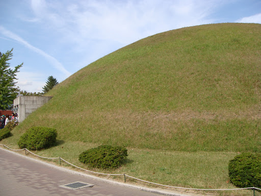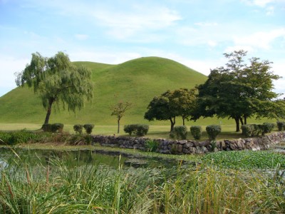 In the centre of Gyeongju, between its intercity bus terminal and train station, is Tumuli Park, or Daereungwon in Korean. The park contains several tombs, a couple of which have been excavated and yielded treasures now designated as important cultural properties by the South Korean government.