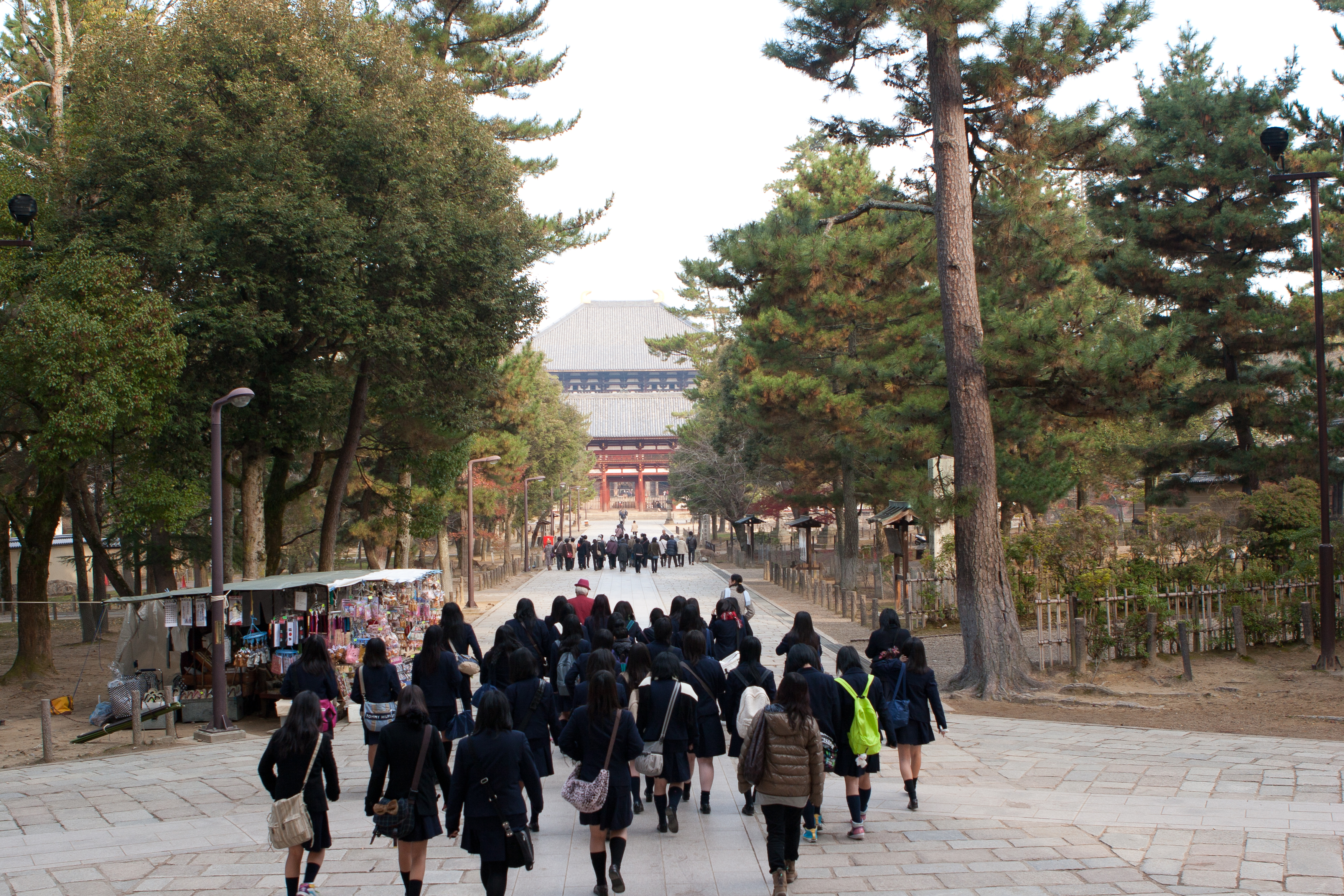 The park is extremely popular with school trips from surrounding areas, and contains many of Nara’s other attractions: Todaiji, Kasuga Taisha, Kofukuji and the Nara National Museum. It is littered with stalls selling cute souvenirs largely aimed at the continuous flow of schoolchildren – toys and kawaii goods with deer overtones. I picked up a great deer hat with little antlers.