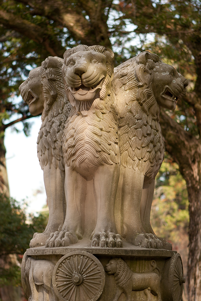 This monument is a replica of the Aśoka pillar-head in Sarnath, India. It was presented to the temple by the All Japan Young Buddhist Association in 1988. Buried beneath it is a time capsule which will be opened in 2038, on the 1,500th anniversary of the introduction of Buddhism to Japan.