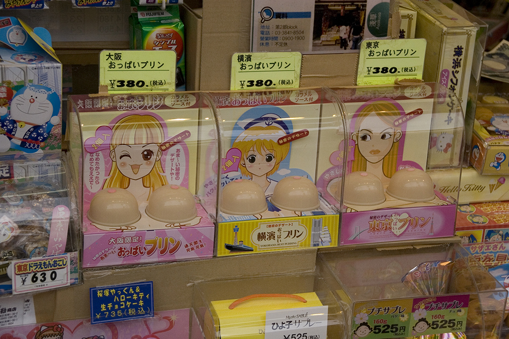Oh, and they also sell oppai, the infamous Niigata Bust Pudding. It is exactly what it says on the box: pudding, shaped like boobs. The packaging is well-designed. Although my photo doesn’t show it, the box is initially closed, and folds out into the display below on opening. Some boxes have a bra layer, which you then peel back to reveal the breasts.