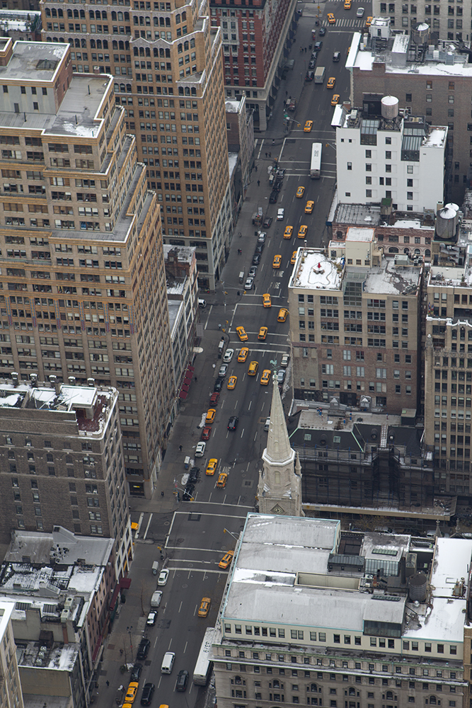 The best way to get a sense of scale is to look directly down to the cars below. Even when the city is grey, the taxis are that world-famous bright yellow, making your elevation suddenly all the more real.